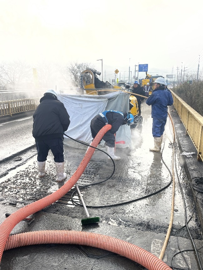 ウォータージェットのメリットは既存の鉄筋を痛めることなく、水の力で既存コンクリートを斫る事ですが、大量の削孔水と鉄筋の下に残るコンクリート殻の撤去が課題です。当社では、どちらも強力吸引車による撤去・処分が可能です。
