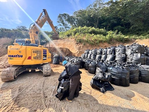 この工事では、重機が安全にアクセスするための仮設道を川の中や不安定な地盤の上に築く必要があります。そこで必要になったのが、仮設道を作るための「大型土のう」です。